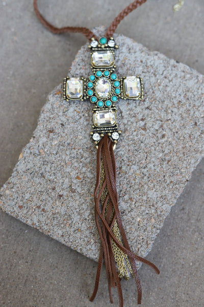 CRYSTAL LARGE CROSS ON BRAIDED NECKLACE