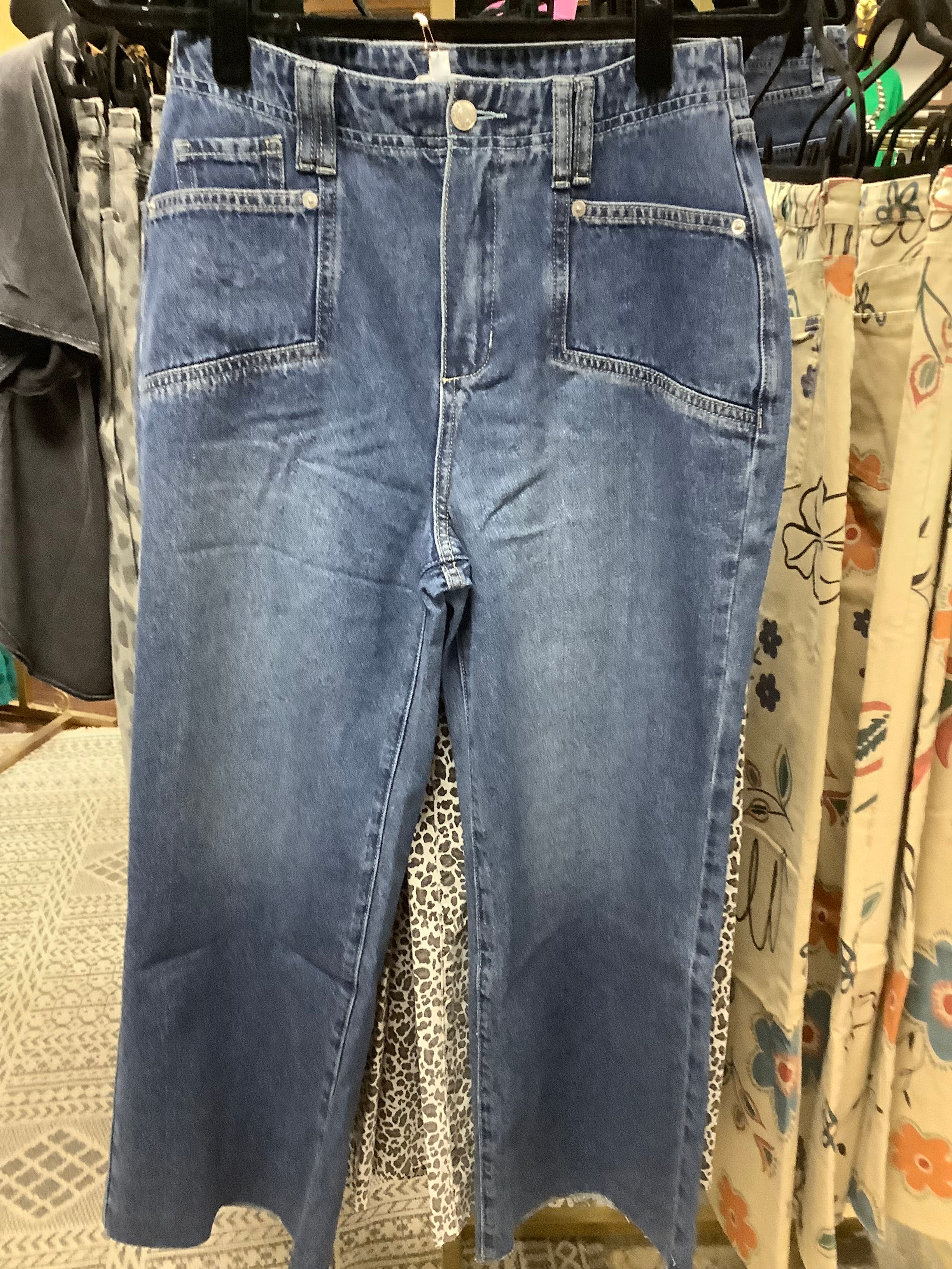 Product Detail: These straight leg pants feature a clean silhouette, a button and zipper closure, belt loops, three front pockets, two back pockets, raw frayed hems, and a relaxed fit, offering a perfect blend of casual comfort and contemporary style.