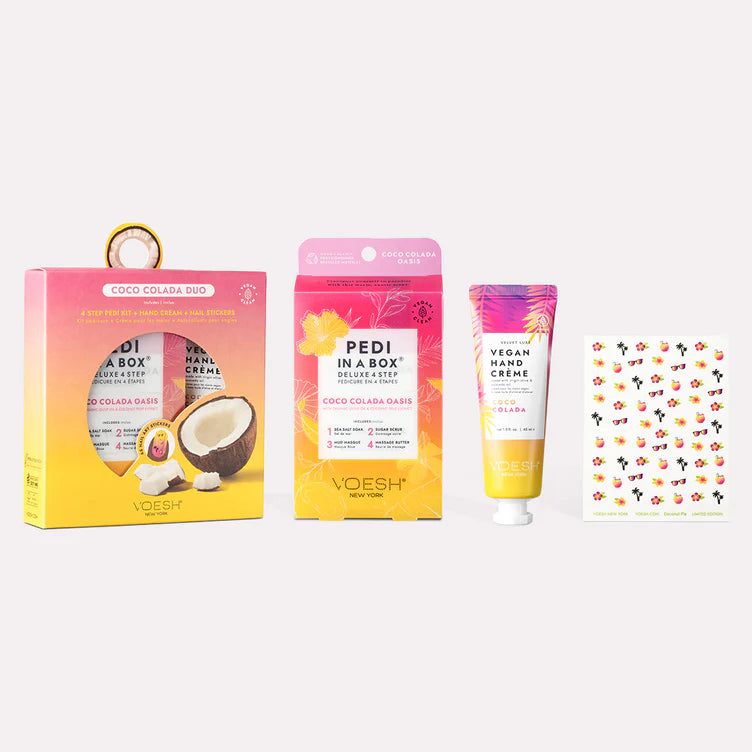 Treat yourself to a tropical get away with this Duo, which includes our Pedi in a Box Deluxe 4 Step, Vegan Hand & Body Crème and fun nail art stickers. This spa pedicure and luxurious lotion duo is the ultimate ticket to flip-flop bliss. Get ready to soak, scrub, mask, and massage your way to silky-soft, scented feet and skin. With the deluxe pedicure kit, you'll start off with a detoxifying sea salt soak, followed by a gentle sugar scrub that will slough off all that dry skin. Then, nourish your feet with a mud masque that will leave them feeling like they've just been to the spa. Finally, seal in all that moisture with a massage butter infused with the warm and creamy aromas. And, with the Vegan Hand & Body Crème, you'll be able to enjoy that same luxurious experience all over your skin. Whether you're slathering it on after a shower, or using it as a daily moisturizer, this lotion is packed with nature's finest ingredients, like fruit extract, organic olive oil, and avocado oil, to leave you with soft, hydrated, and glowing skin. Close your eyes, take a deep breath, and imagine yourself on a sandy beach with a drink in your hand. Paradise, here you come!