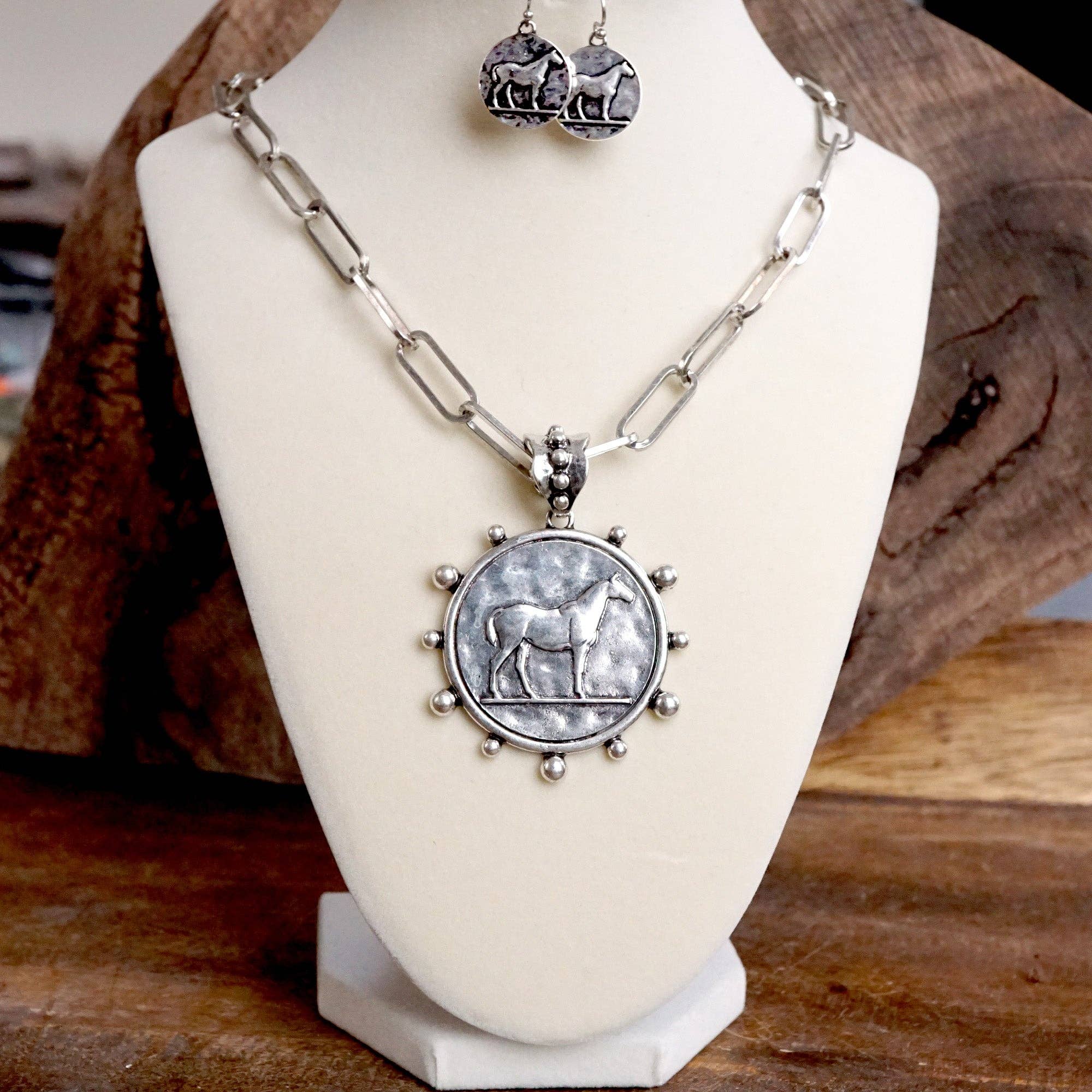 Equestrian Western Horse Coin Statement Necklace Set – Worn Silver Tone