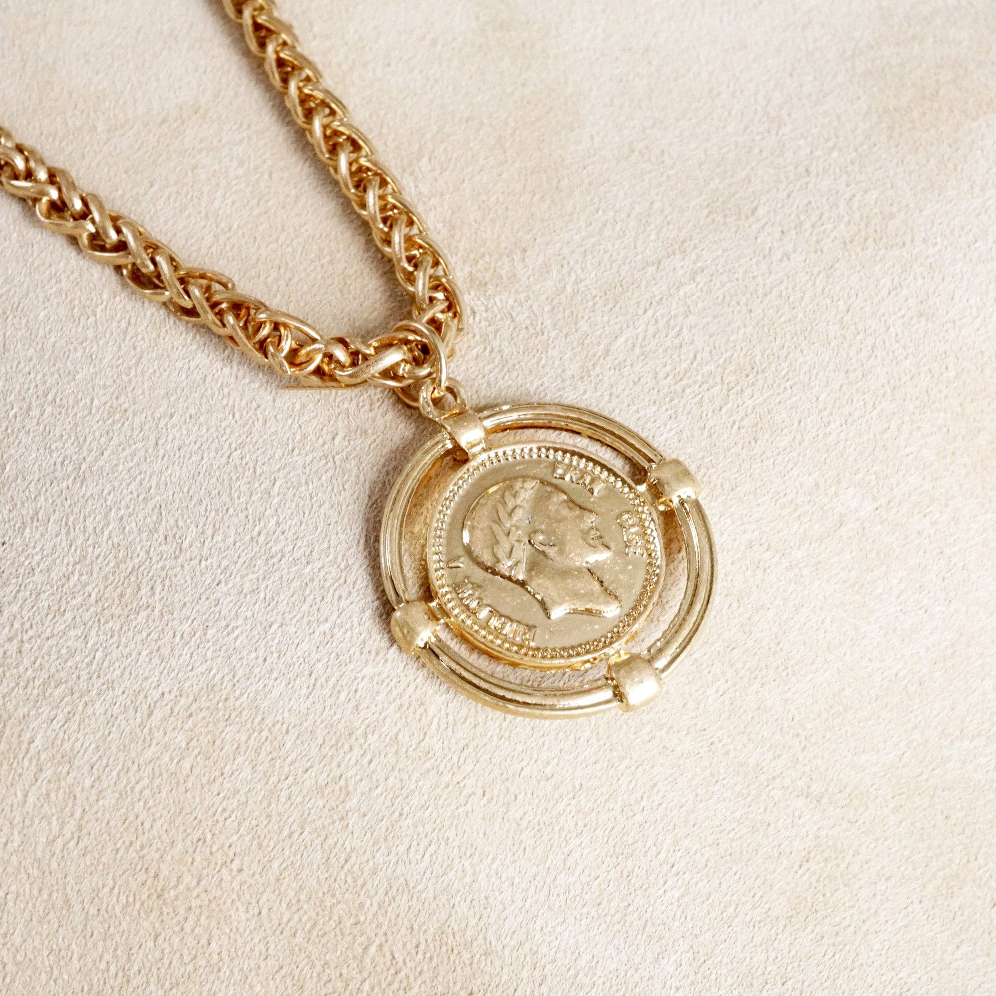 Key Features: * 1.25" worn gold antique-style coin pendant * Worn gold-tone wheat chain * 16" chain + extender * Boho style, ideal for layering * Versatile and timeless design