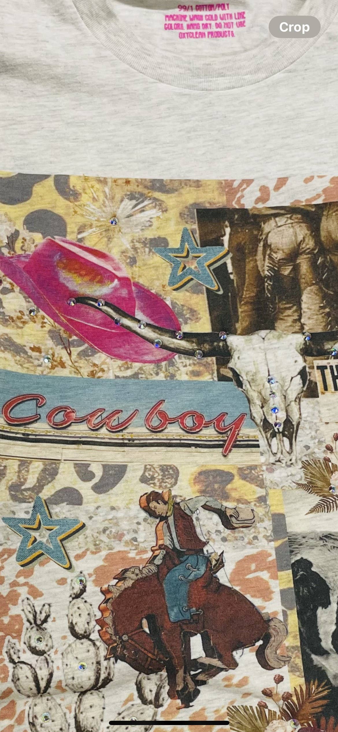 The world needs more cowboys printed on a heather oatmeal tee complete with handset crystals.