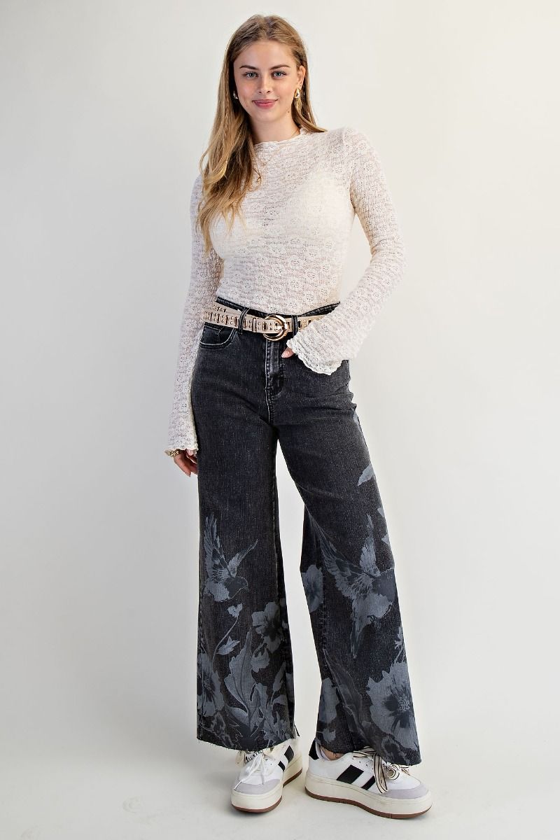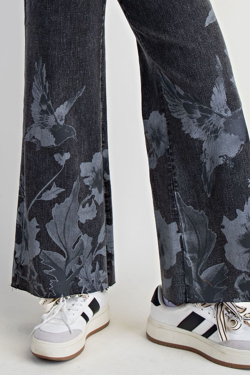 Description: FLORAL PRINT WASHED STRETCH DENIM PANTS