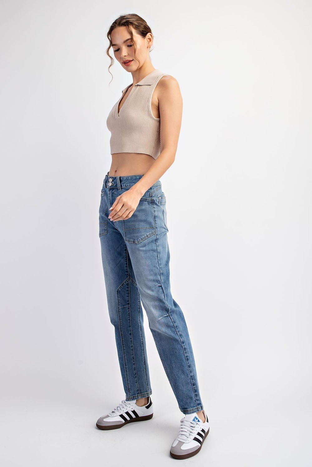 Denim jeans featuring a double button and zipper closure, two open side hip pockets, two back pockets, added yellow seams throughout for detail, belt loops, added seams for a slimming effect and is a skinny leg style.