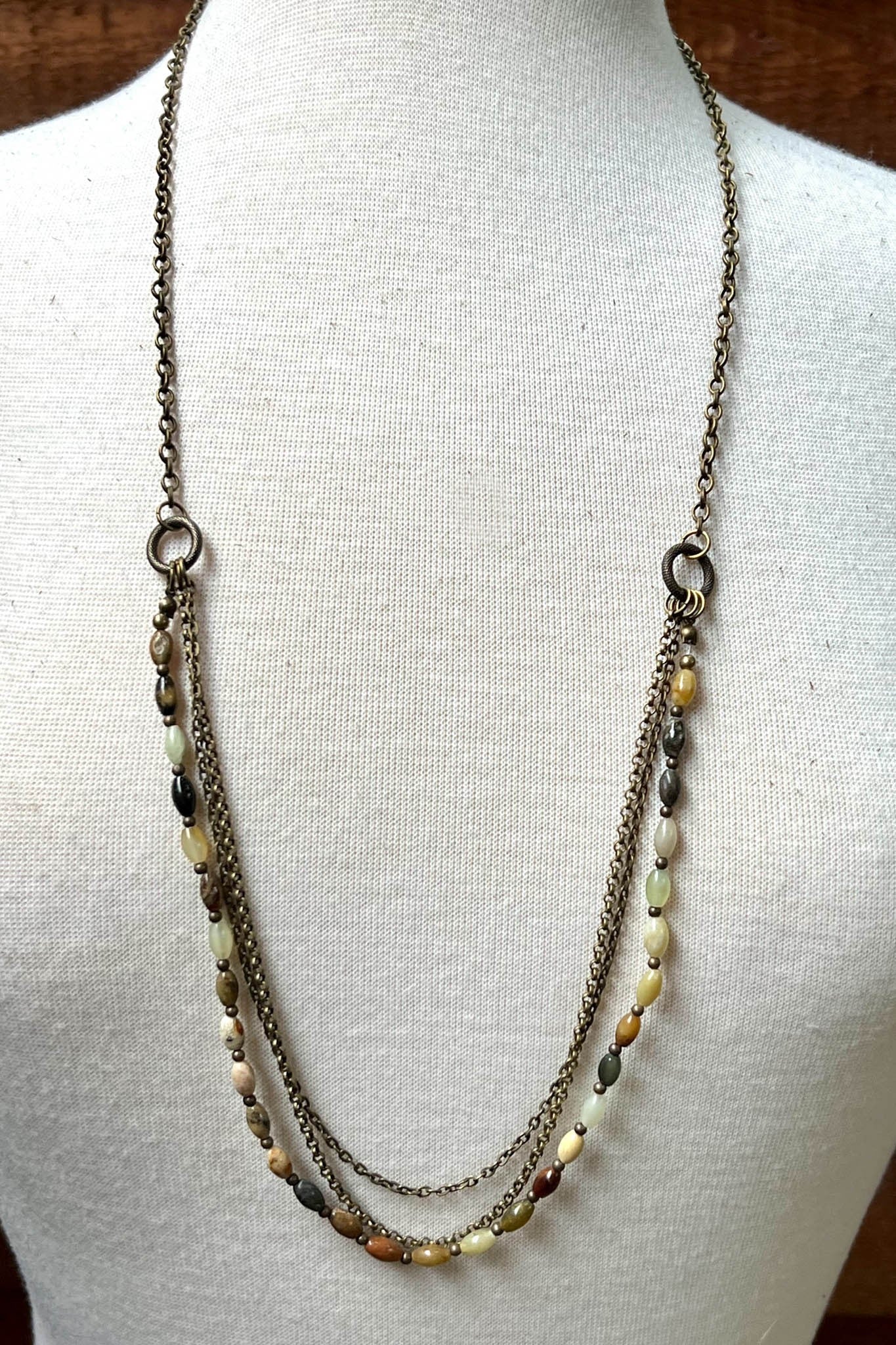 Long, dainty chain necklace with 3 layers. One layer is beaded with oblong beads.