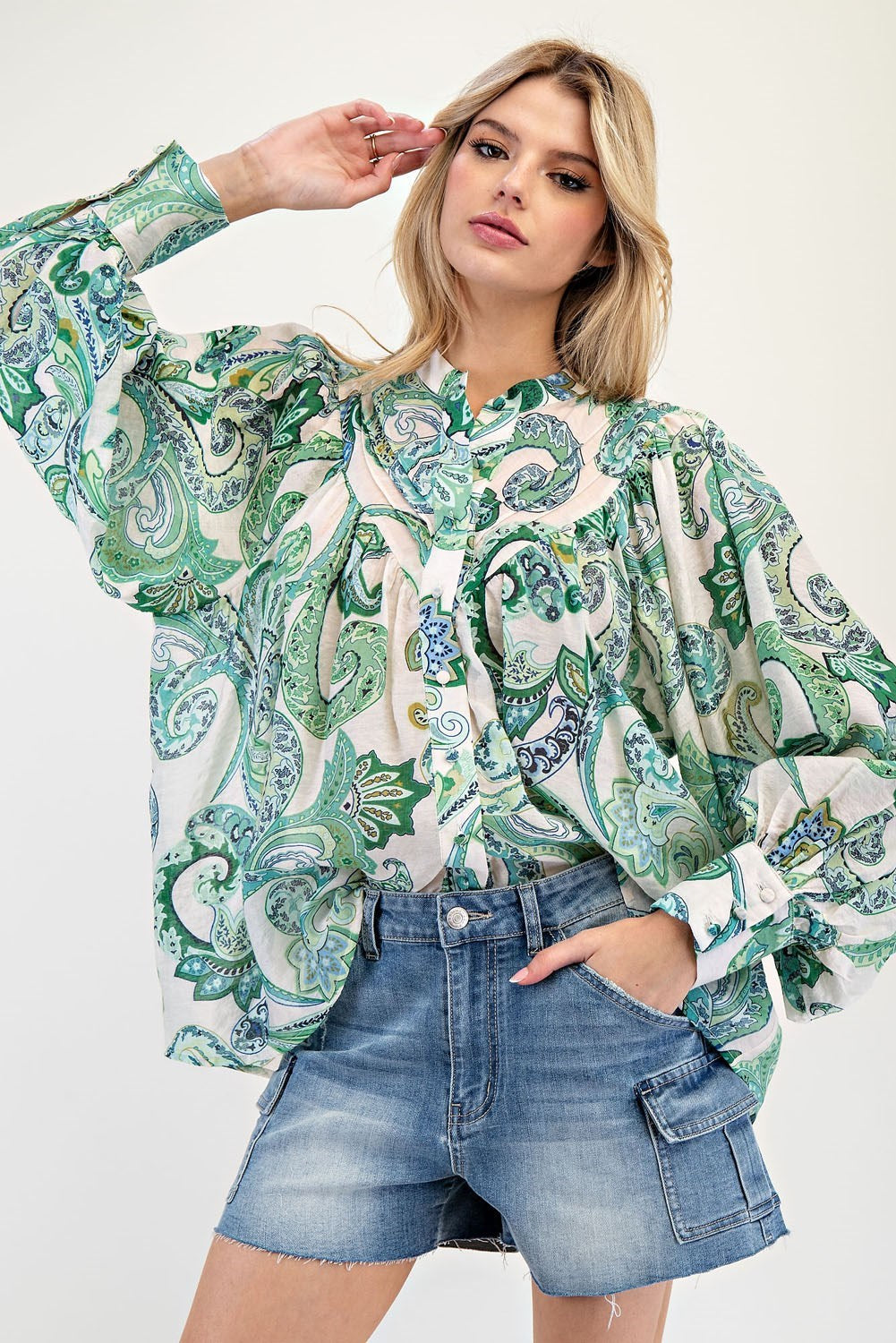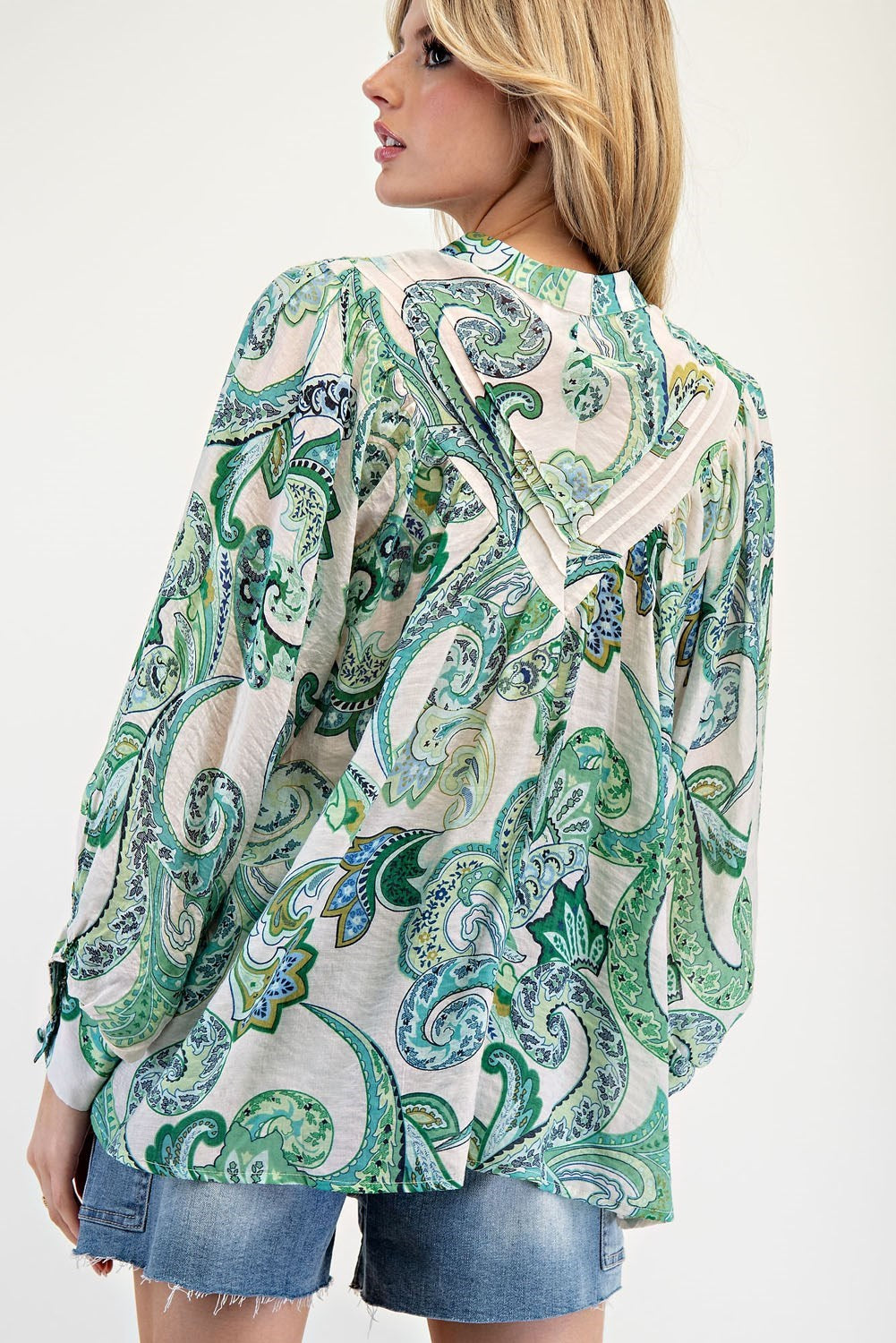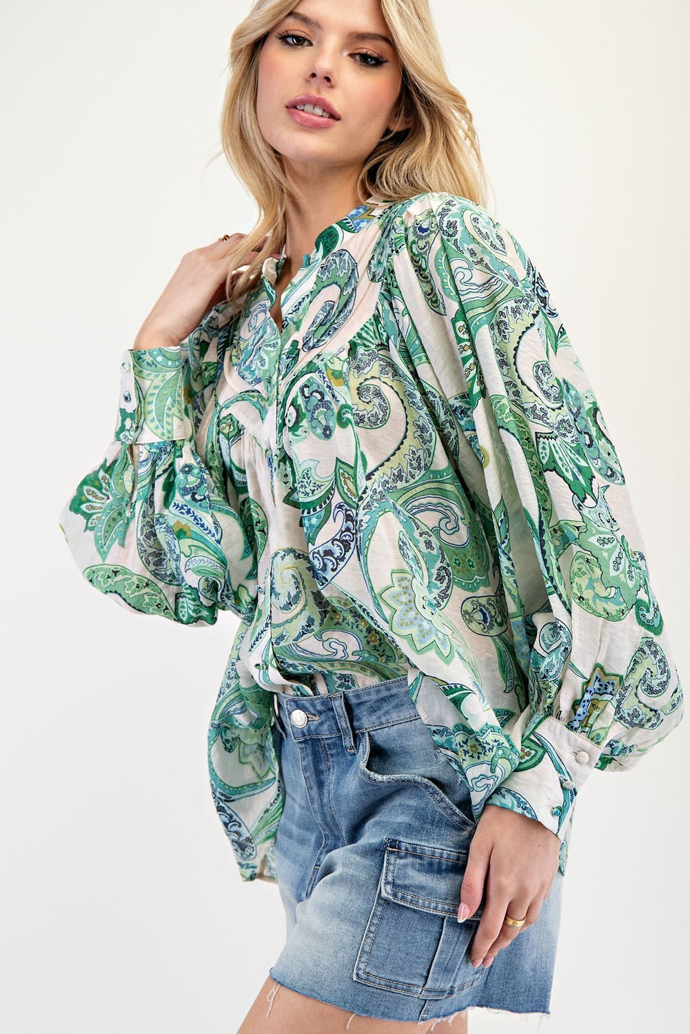 Product Detail: Paisley printed long sleeve blouse top featuring a rounded neckline, buttoned cuffs creating a bubble sleeve effect, a button down front, added pleats for detail and is a lightweight, relaxed fabrication.