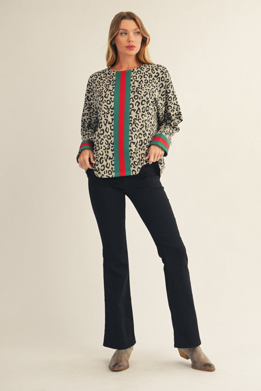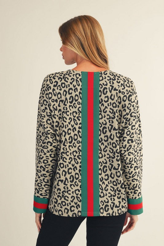 Drop shoulder leopard top with color rib band accent. - Model is 5'8'' and is wearing a Small.