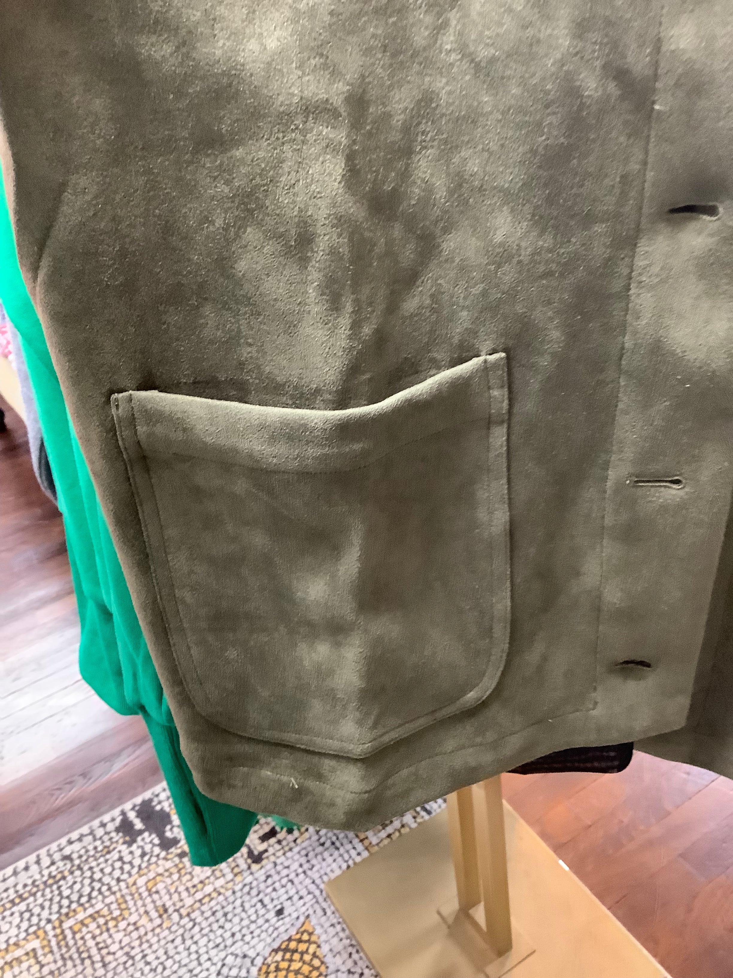 Elevate your outerwear game with this effortlessly cool jacket in a soft suede-like finish. Designed in an earthy olive tone, it features a structured collar and sleeves for a modern silhouette. The cuffs and brown buttons add a touch of polish, making it a versatile layering piece for transitional weather. Style it over a crop top and high-waisted jeans for a laid-back, contemporary look.