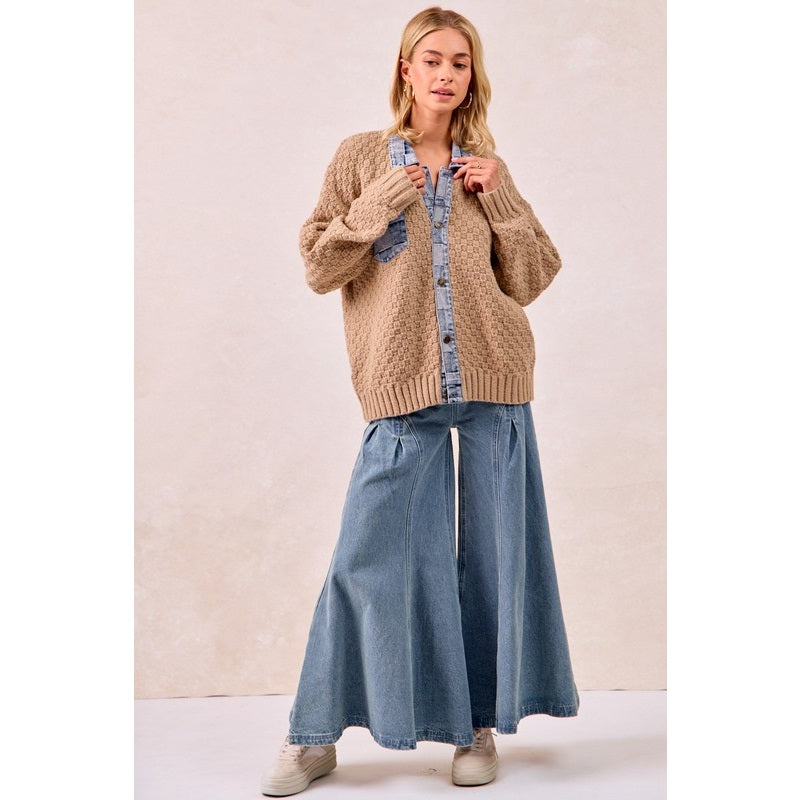 Description: Latte Sweater with mixed denim features with metal buttons that say jeans