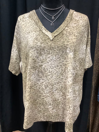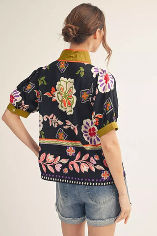 Green Printed Button-Down Top with 3/4 Length Gathered Balloon Sleeves
