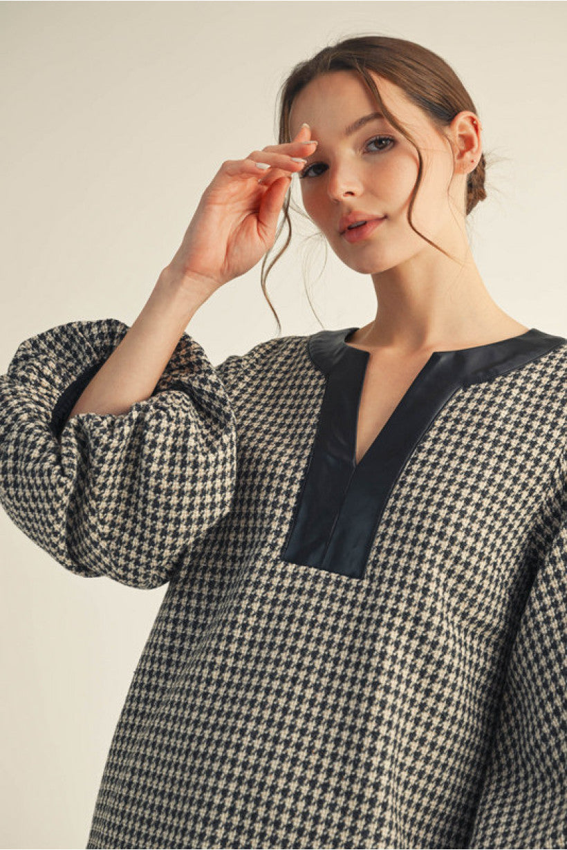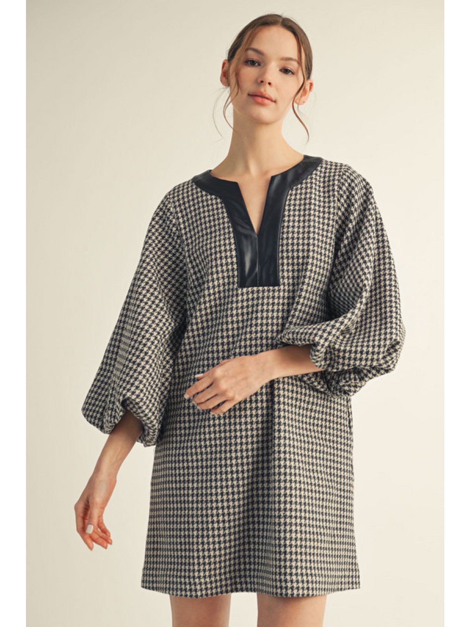3/4 balloon sleeves herringbone dress with faux leather contrast, side pockets.