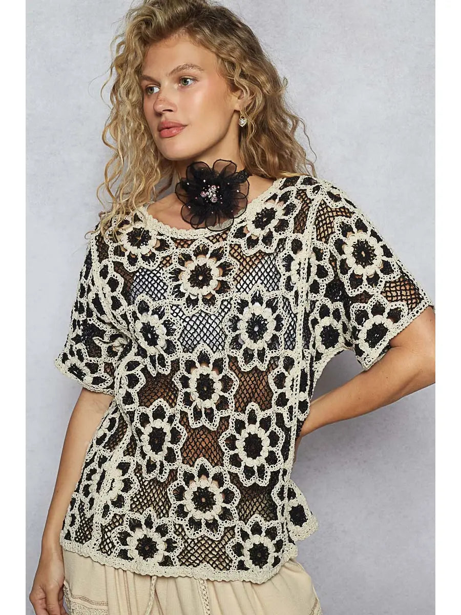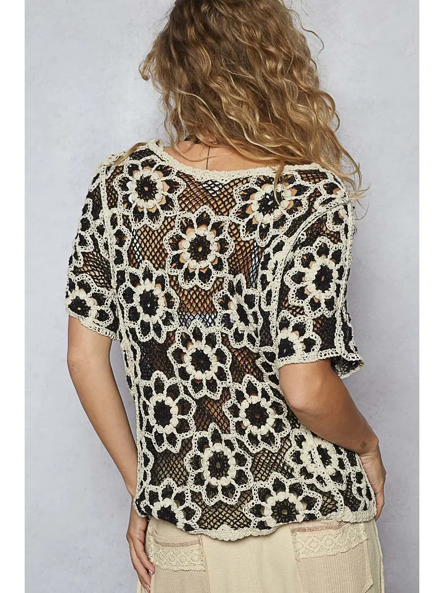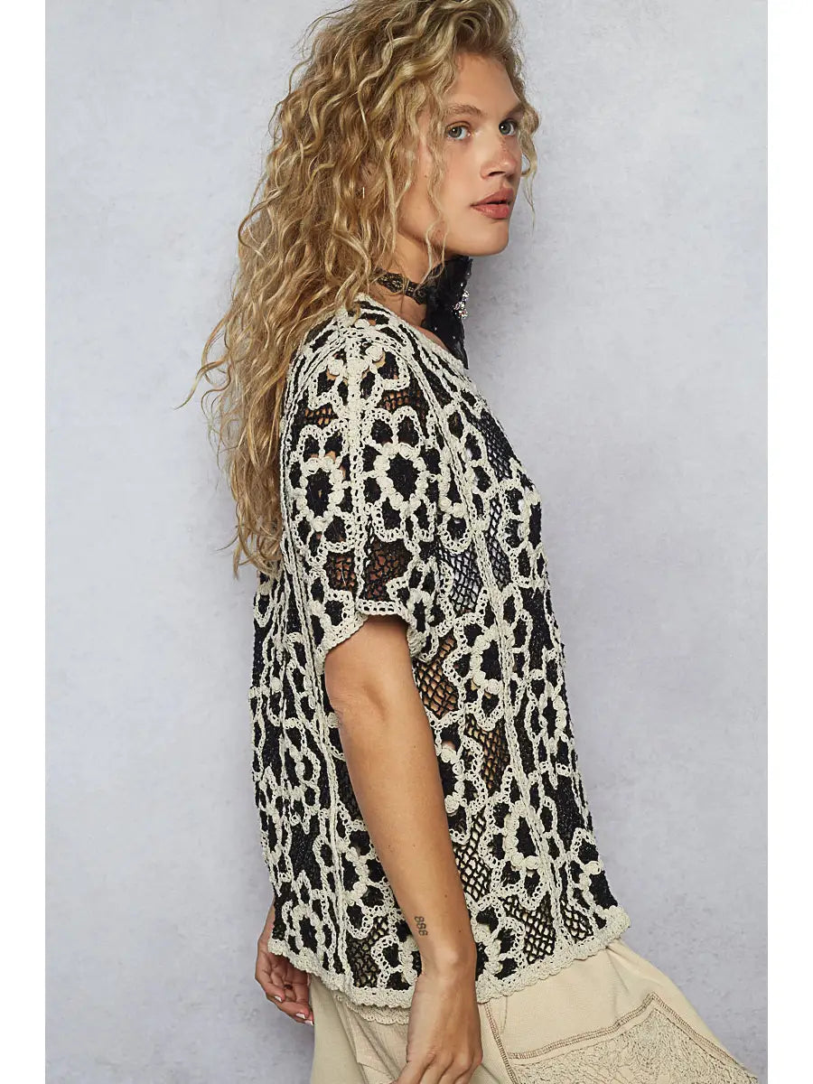 Designed in round neck short sleeve regular fit top in crochet with various colors and weave knit patterns.