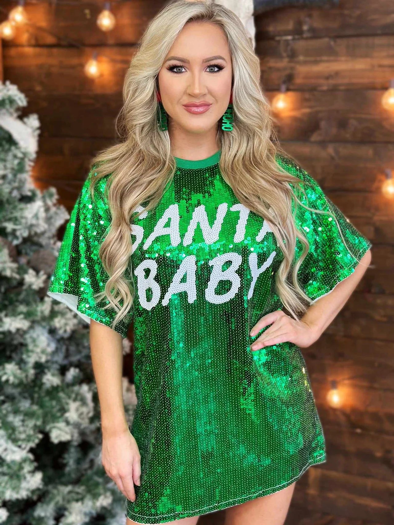 Round Neck Short Sleeve "SANTA BABY' Print Sequin Tunic Top 100% POLY