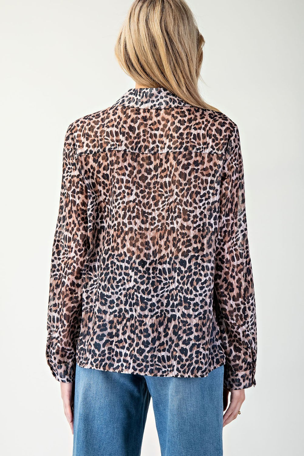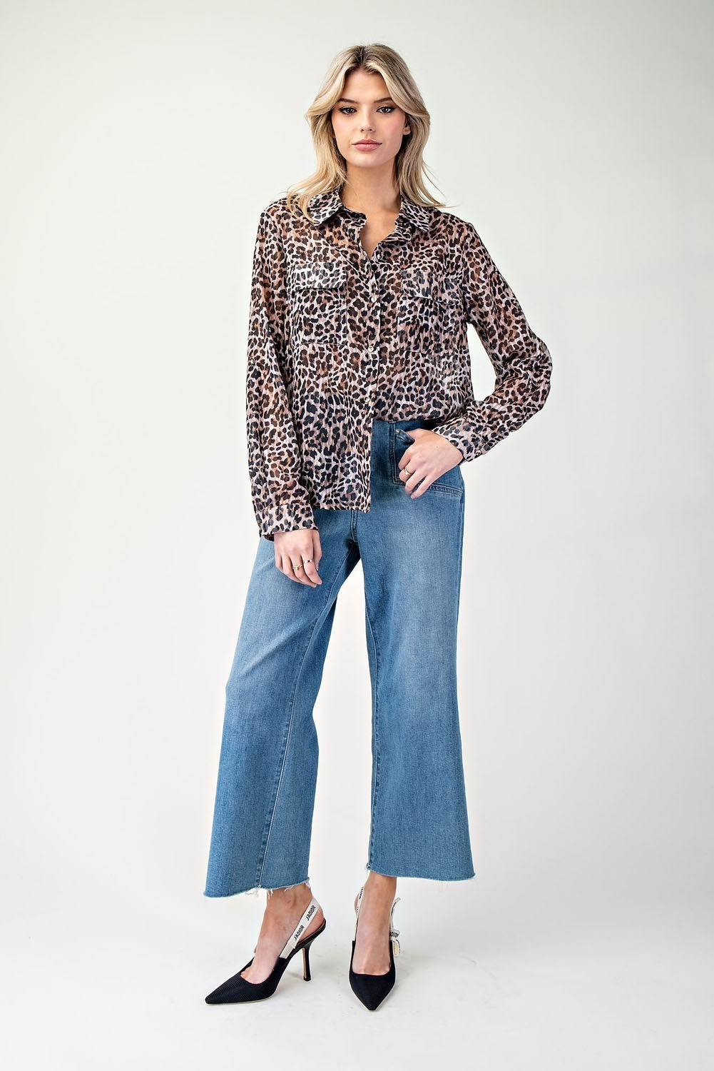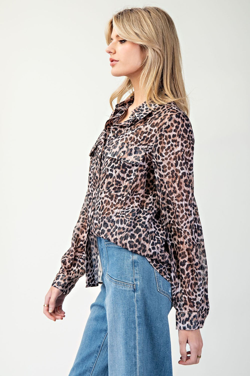 Product Detail: Leopard printed long sleeve blouse top featuring a button down front, a collared neckline, two front chest pockets with button closures, buttoned cuffs, an added button down the arm to roll and pin for a 3/4 sleeve look and is a slightly sheer.