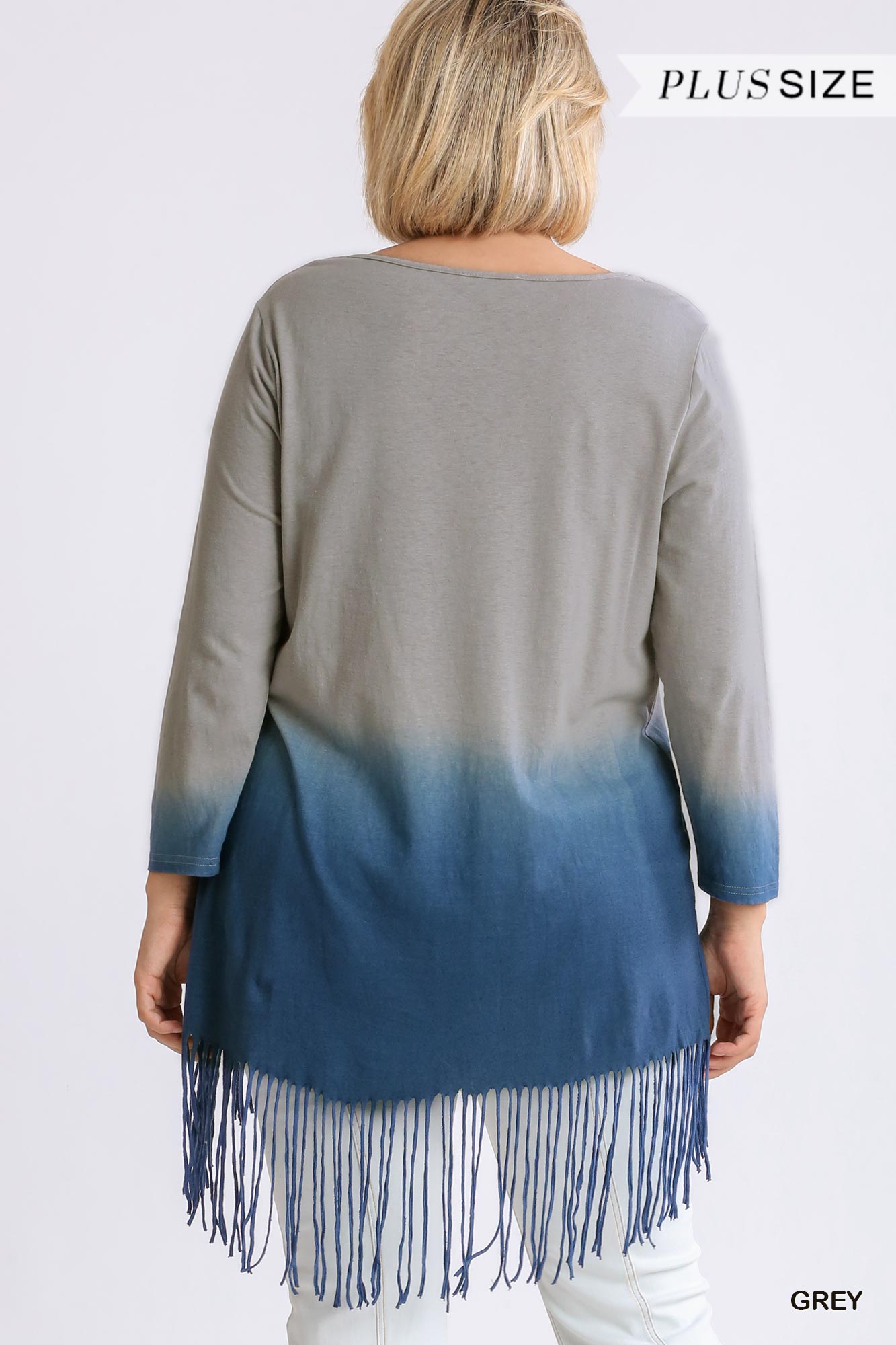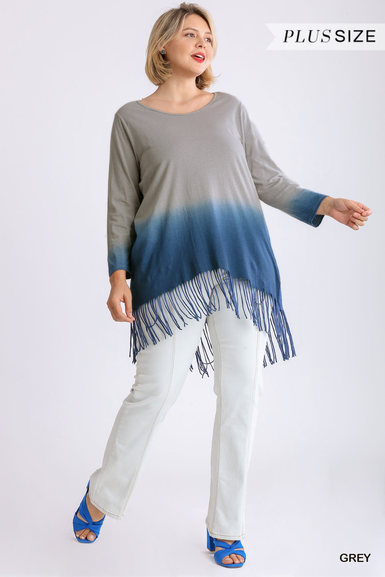 Linen Blend Dip Dye Round Neck Long Sleeve Tunic Top with High Low Fringe Hem