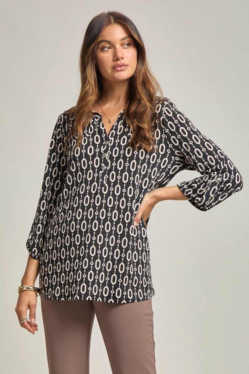 This is our classic blouse, updated Lizzy style in a classier look! We love the faux pockets on the front with nice neckline with easy, relaxed fit. Travel friendly and wrinkle-free.