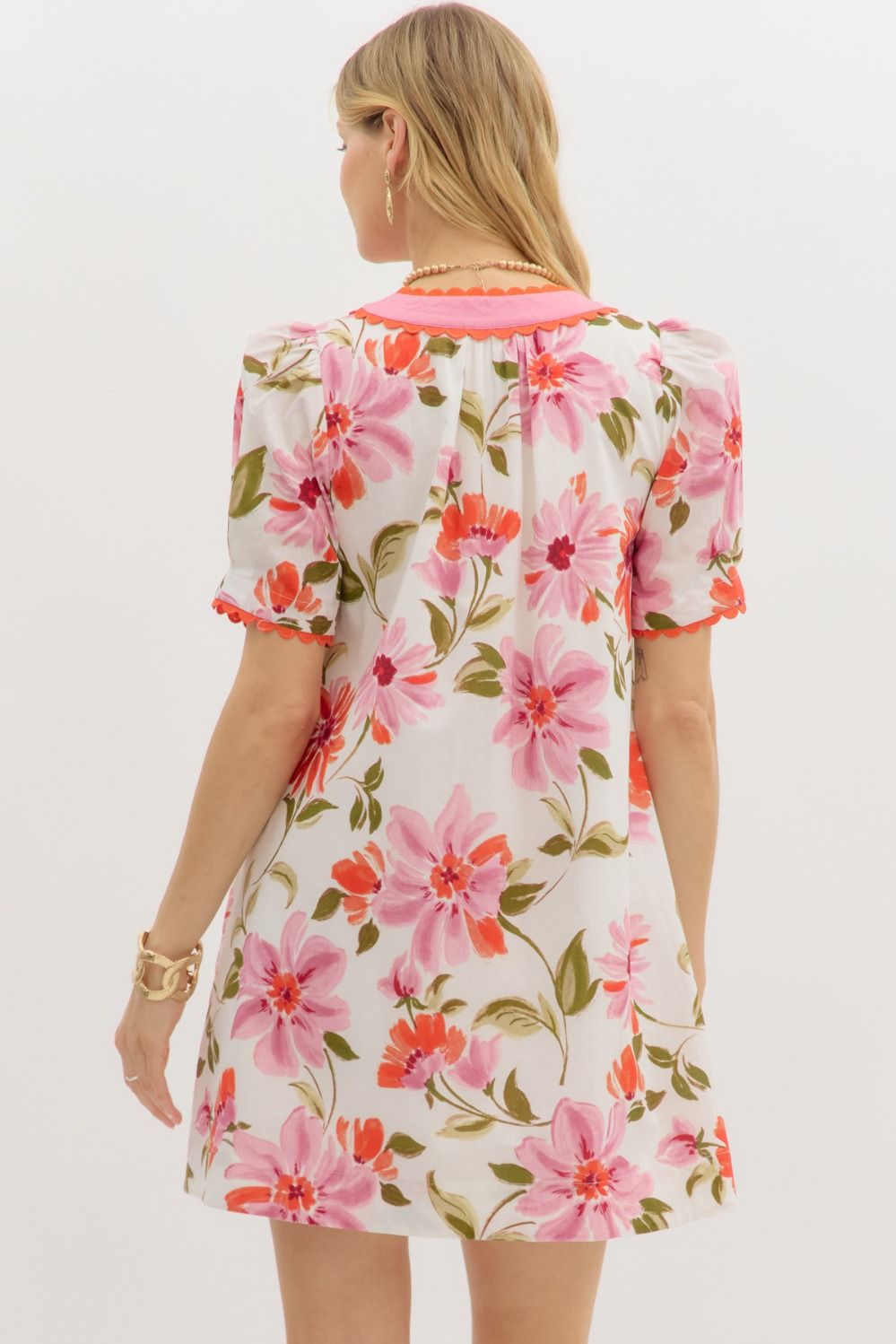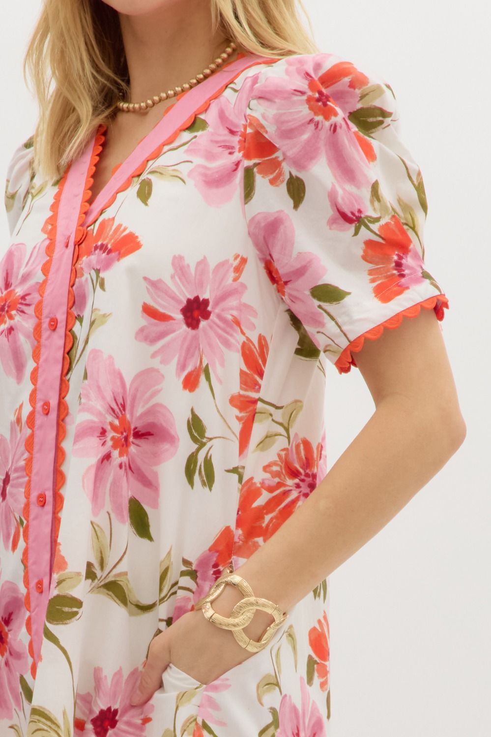 Floral print structured shoulder short sleeve mini dress featuring contrast accent scallop trim inset. Button front closure. Pockets at sides. Lined. Woven. Non-sheer. Lightweight.