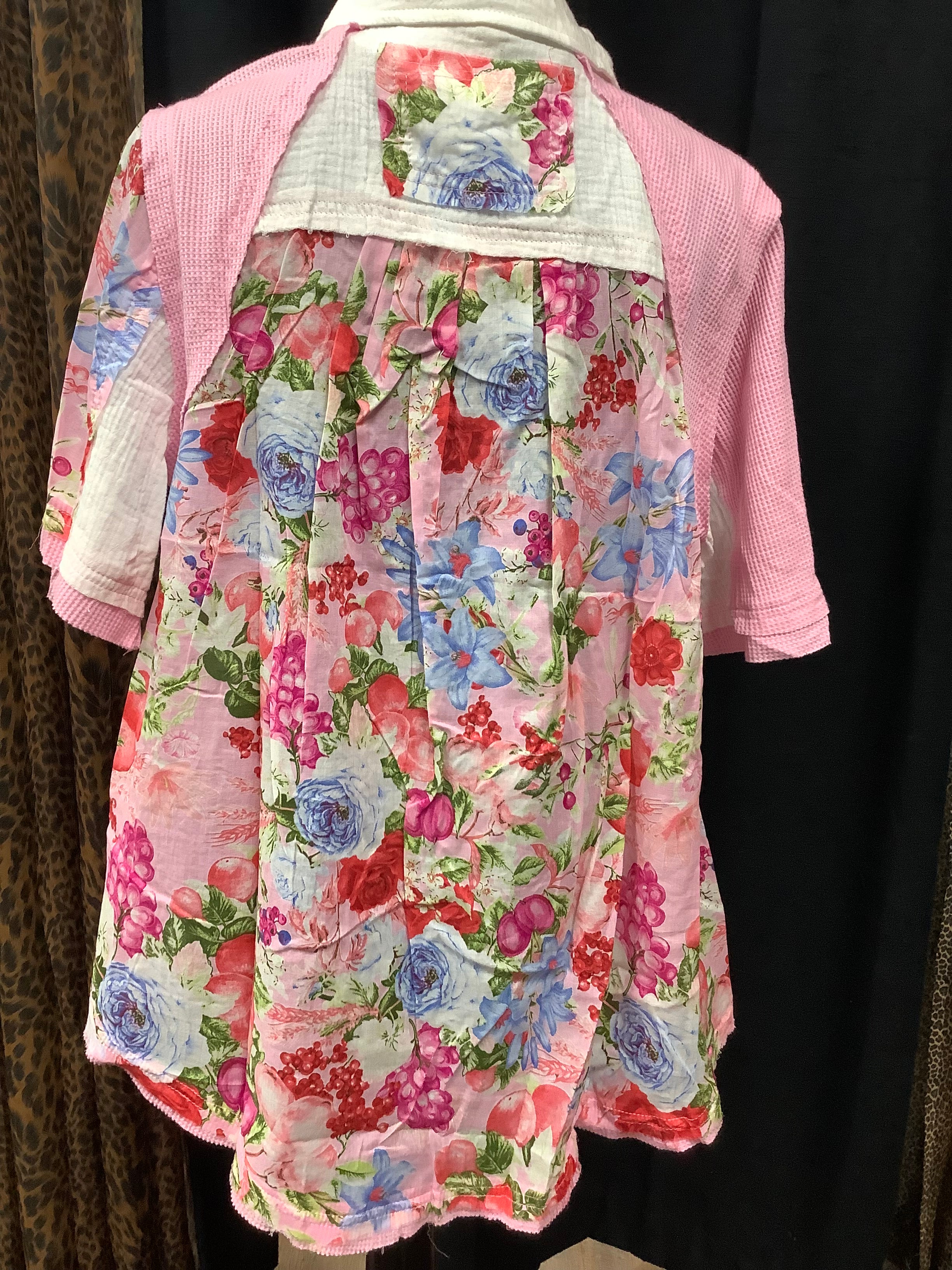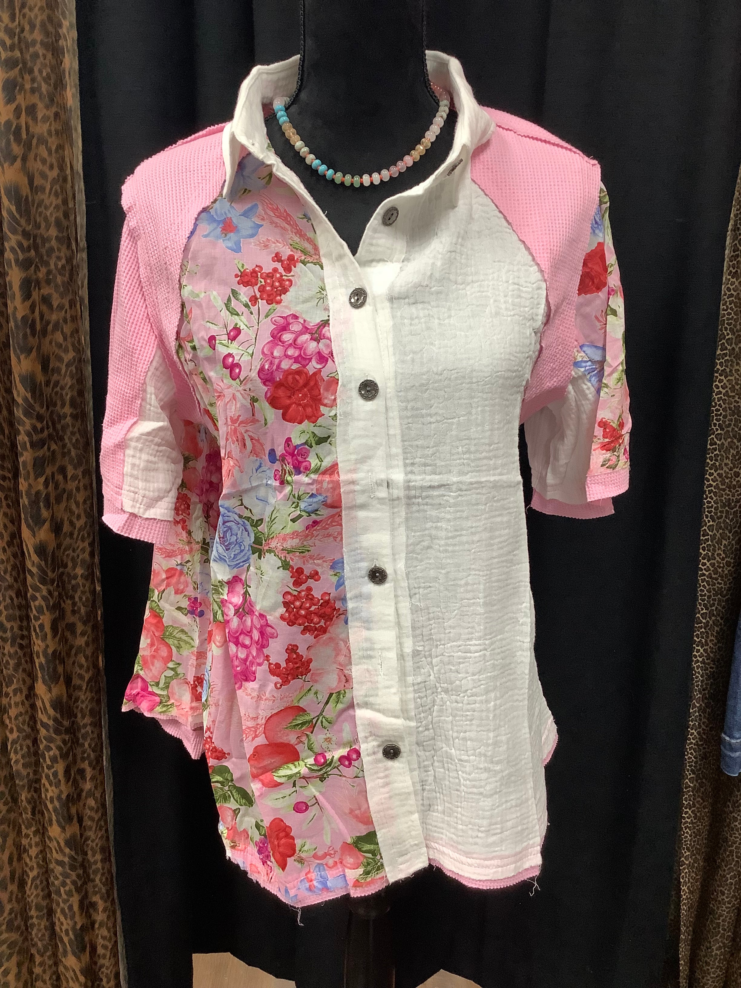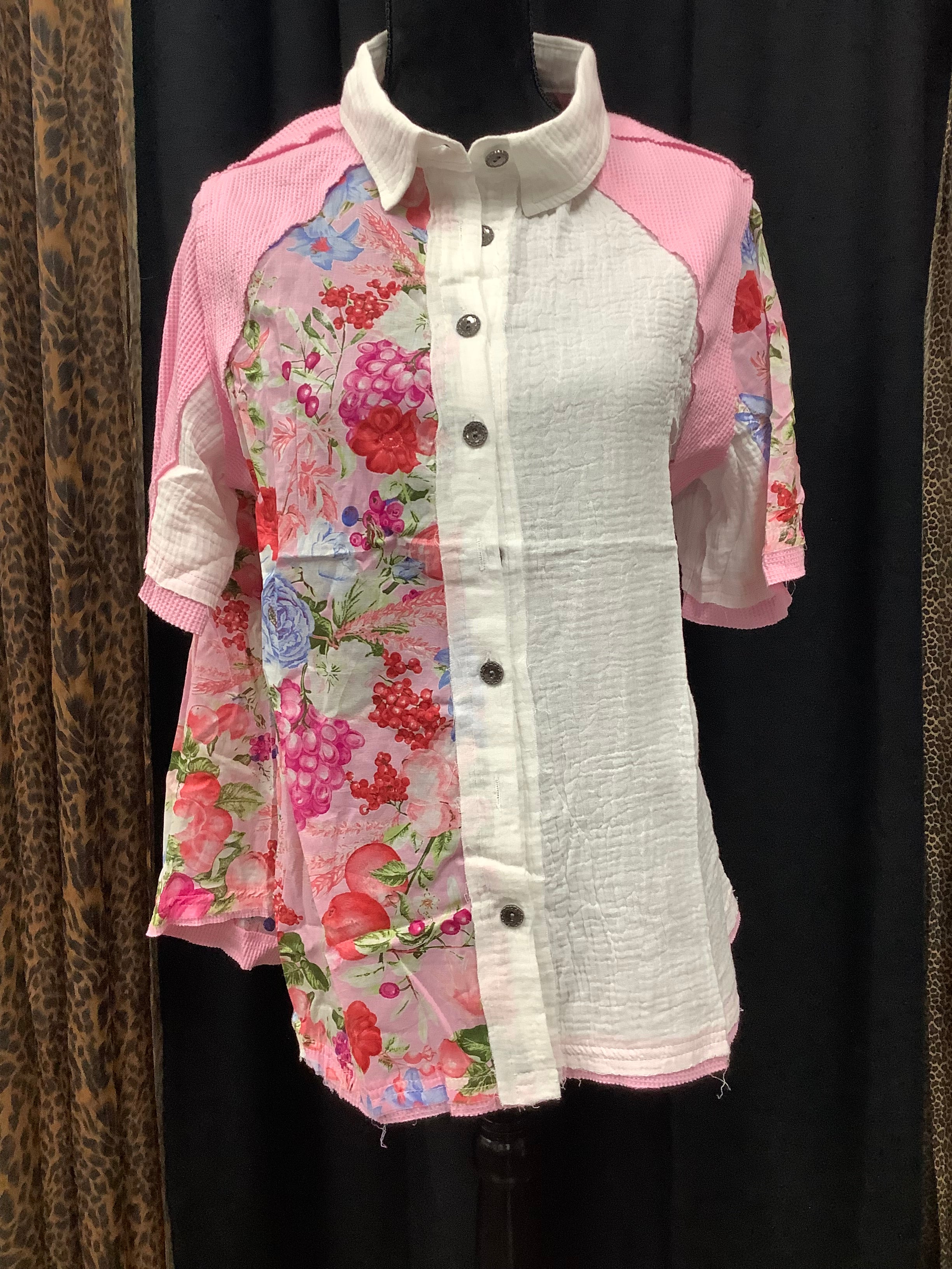 Designed in collar neck, short sleeve, relaxed fit shirt top in printed woven with color blocked binding detail, trim point, normal washing, pink and floral pattern.