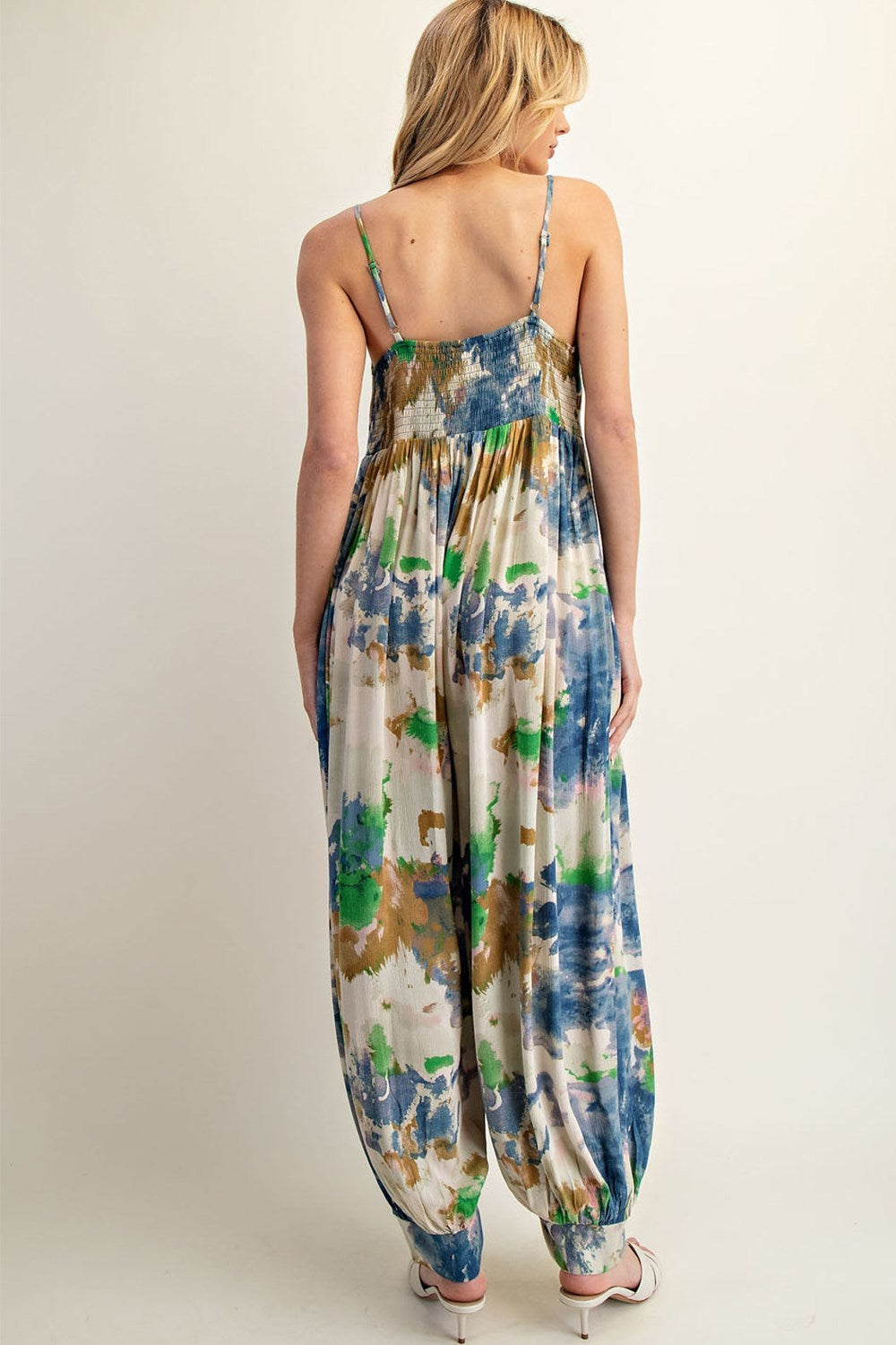 Tie dye sleeveless jumpsuit featuring a half button down front, two side hip pockets, is pinched throughout for extra detail, a smocked back, adjustable straps and is a jogger design.