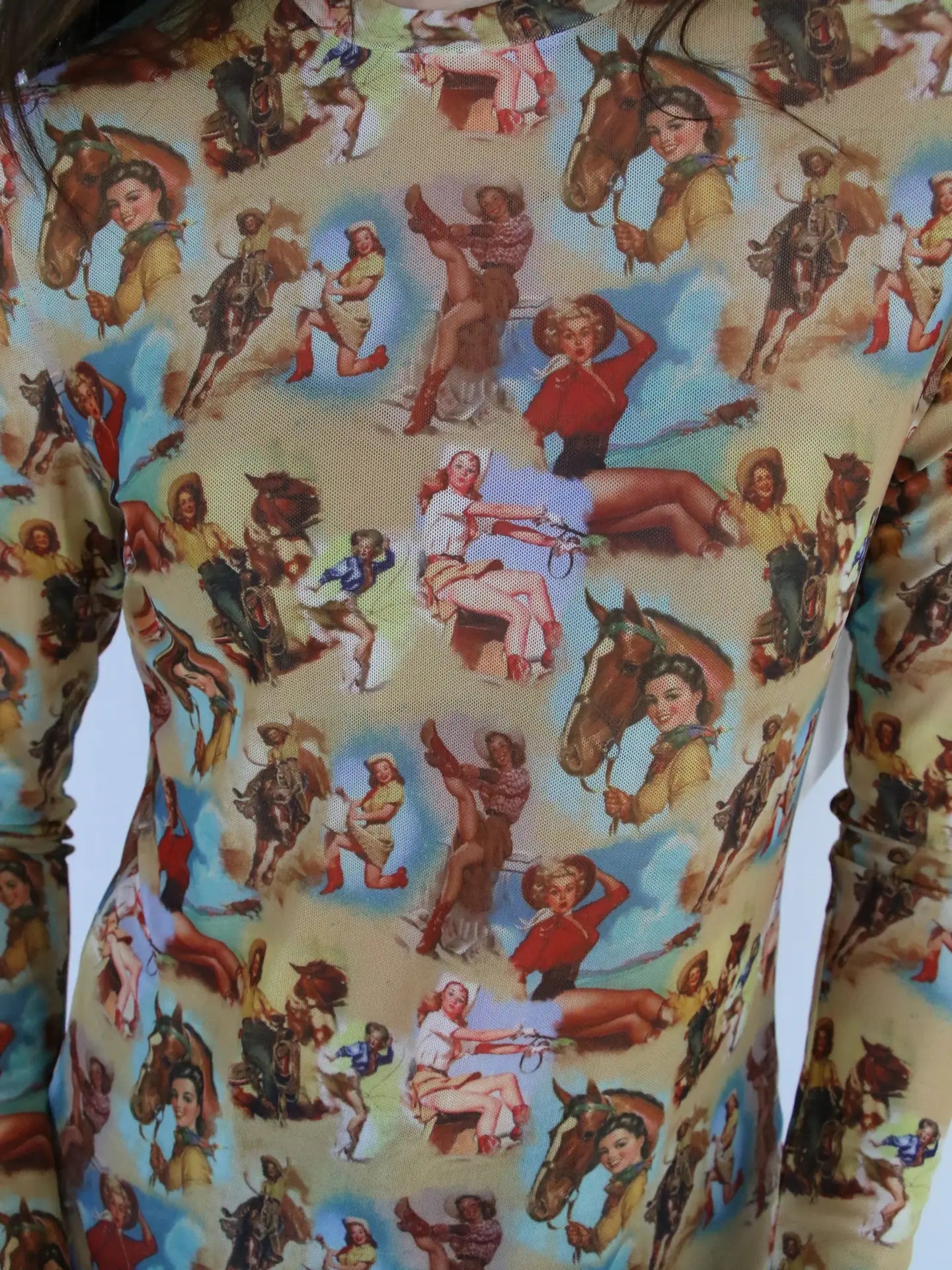 Fitted Mesh Top This fitted mesh top features a retro-inspired vintage cowgirl print, perfect for adding a touch of Western flair to your wardrobe. Crafted from stretchy, breathable mesh fabric, it provides a sleek and comfortable fit. Its bold print and versatile design make it an ideal layering piece or a standout on its own.