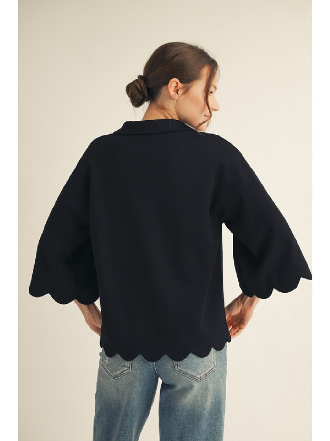 3/4 sleeves v neck top with scallop edge detail, collared neckline.