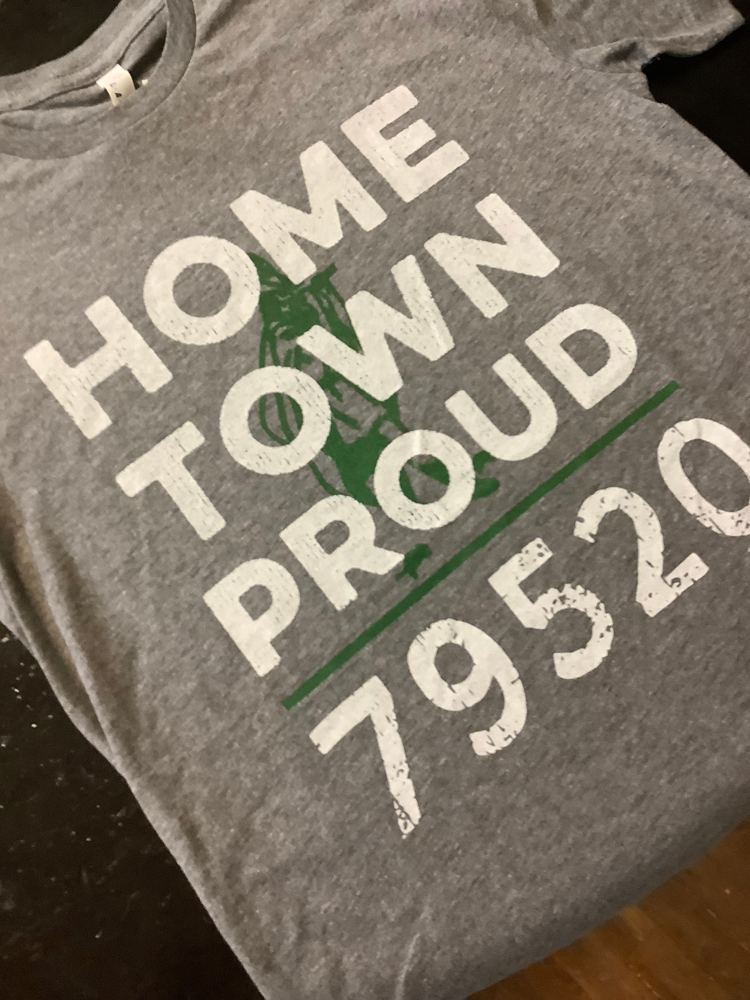Gray Tee with green Piper with Home Town Proud 79520 printed over it in white letters